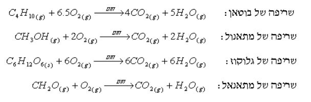 דוגמאות לתהליכי שריפה של תרכובות אורגניות שונות