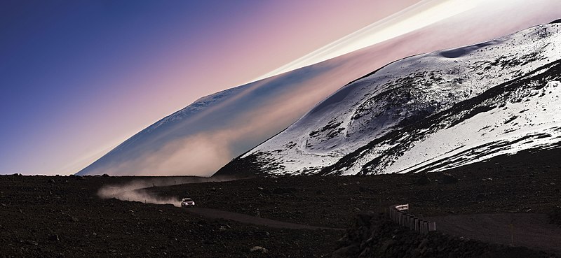 זרימה מרהיבה של לבה בזלתית על מדרונות ההר.